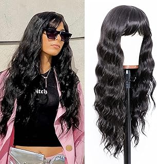 ANDRIA Curly Wigs with Bangs Long Wigs for Women Synthetic Natural Wavy Wig Loose Curly Wig Heat Resistant Fiber 24 Inches Black Color Hair Wave Wigs for Black Women
